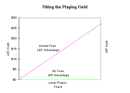In summary, the debate over access fees should be considered from the perspective that different groups are trying to secure competitive advantage through regulation. It is possible that with the current access fees IAP's and LD carriers currently have a slight competitive advantage over the LEC's. The size of this competitive advantage is likely to be small and could be eliminated by charging slightly higher flat-rate monthly access fees to IAP's. This could be done in a way that makes IAP's responsible for their own increased use to avoid economic inefficiency. Imposing usage-based, per-minute fees has the potential to give the LEC's a very large competitive advantage while causing the US economy to lose billions of dollars due to inefficiency.