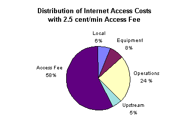 Figure 3 shows how the cost percentages for IAP's change if an access fee of 2.5 cents/min is added. The main point of this diagram is that if an access fee were charged then it would dominate all other costs. Because the LEC's would only pay this fee internally, this would given them an extreme competitive advantage.